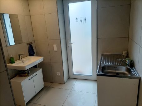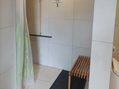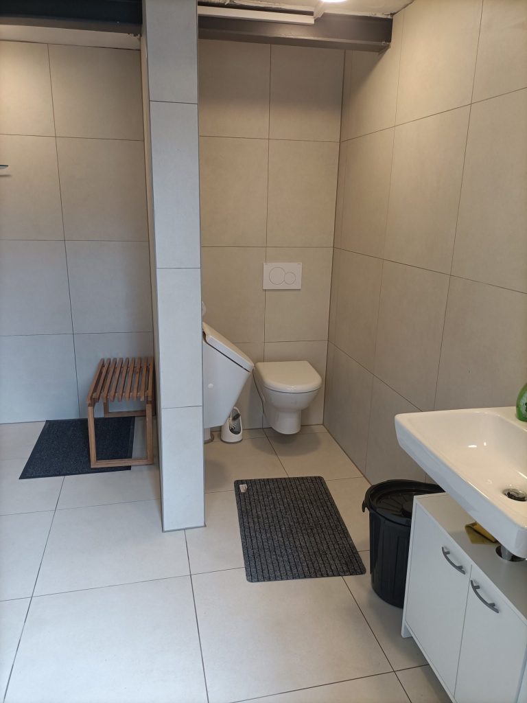 ausgestattet mit Toilette, Pissoir, großräumige Dusche, Waschbecken, Spülbecken,